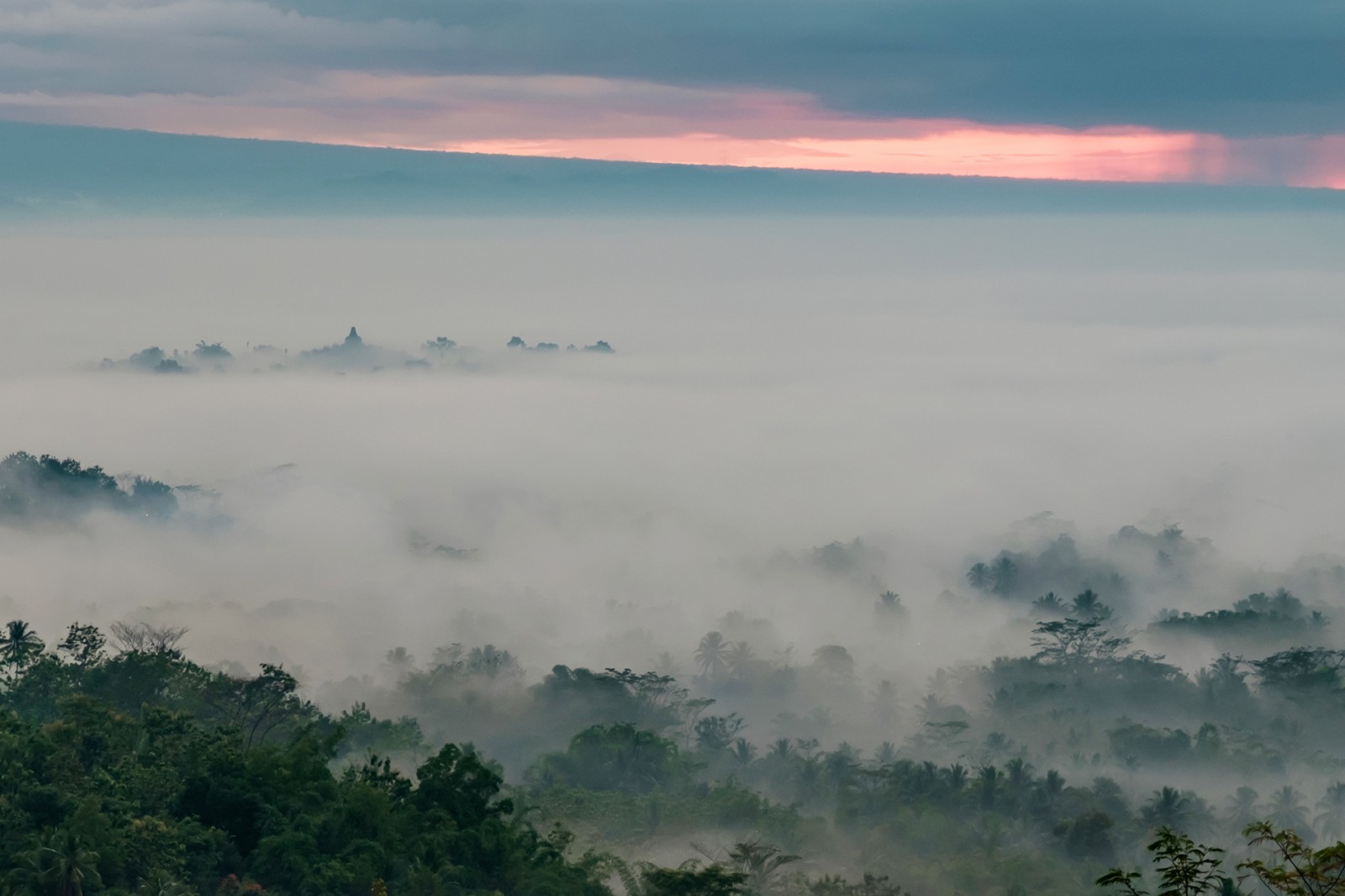 Menikmati kabut, puncak stupa borobudur, gunung merbabu dan gunung merapi dari atas bukit.