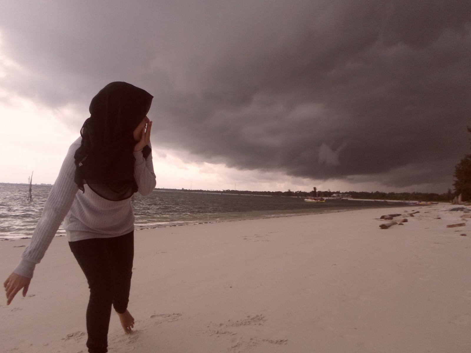 Mei 2015, saya dan teman saya memtuskan untuk travelling ke Belitung denga agen Wisatakita. Hari pertama awan mendung...sedih si travelling ke daerah pantai tapi mendung. Hujanpun mengantar perjalanan kami ke penginapan. Karena hari mulai sore, guide mengajak kami untuk makan di daerah dekat pantai. Perjalanan ke pantai tetap saja hujan,senangnya dan akhirnya kami terlepas dari awan hujan namun langit masih mendung. Sesampai di tempat makan, kami memutuskan untuk berjalan sebentar ke daerah pantai dan WOW....Pemandangann yang unik. Langsunglah saya jadi model dadakan. Ternyata ada keindahan seperti ini menjelang hujan di daerah pantai.