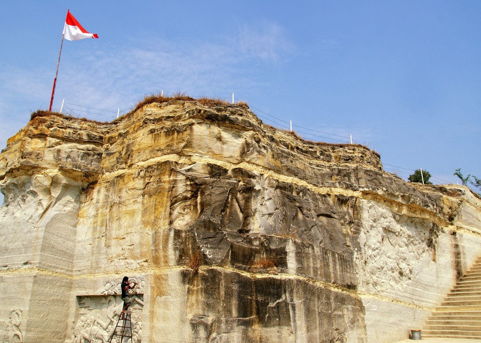 Seorang pemahat mengukir tebing Breksi dengan motif wayang. Tebing Breksi menambah satu lagi tempat yang fotogenik dan "instagramable" di daerah Yogyakarta.
