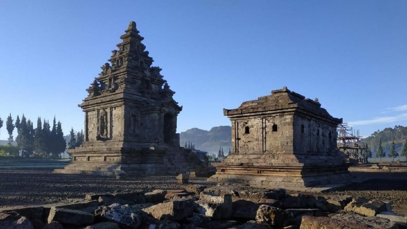 Dataran tinggi Dieng mempunyai banyak candi kecil kuno yang indah. Kebanyakan candi di daerah ini merupakan candi yang bercorak Hindu dengan arsitektur yang unik. Candi-candi ini mempunyai nama yang di ambil dari tokoh-tokoh cerita epik Mahabarata seperti Gatotkaca, Arjuna, Bima dan Srikandi. Diyakini bahwa di candi-candi ini dahulu merupakan tempat tinggal para pendeta yang menyebarkan agama Hindu.